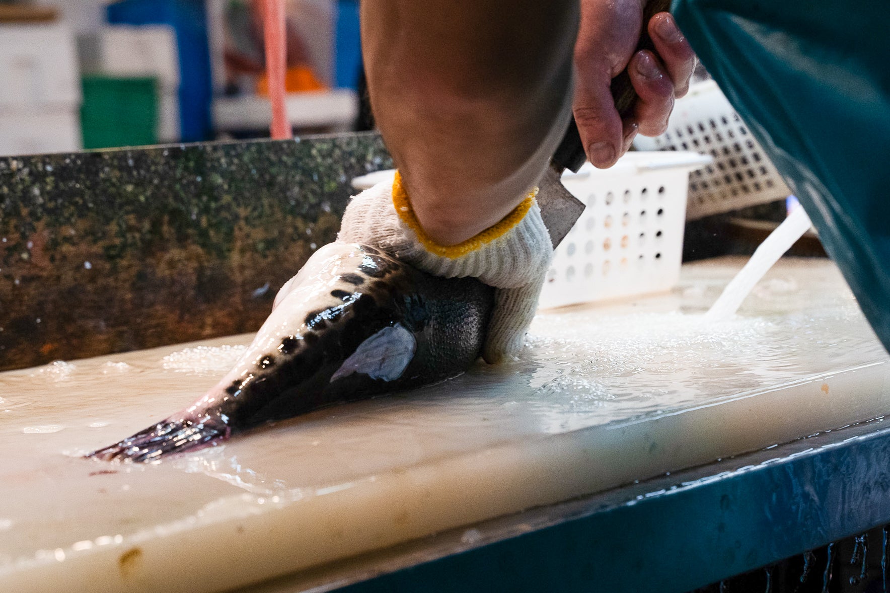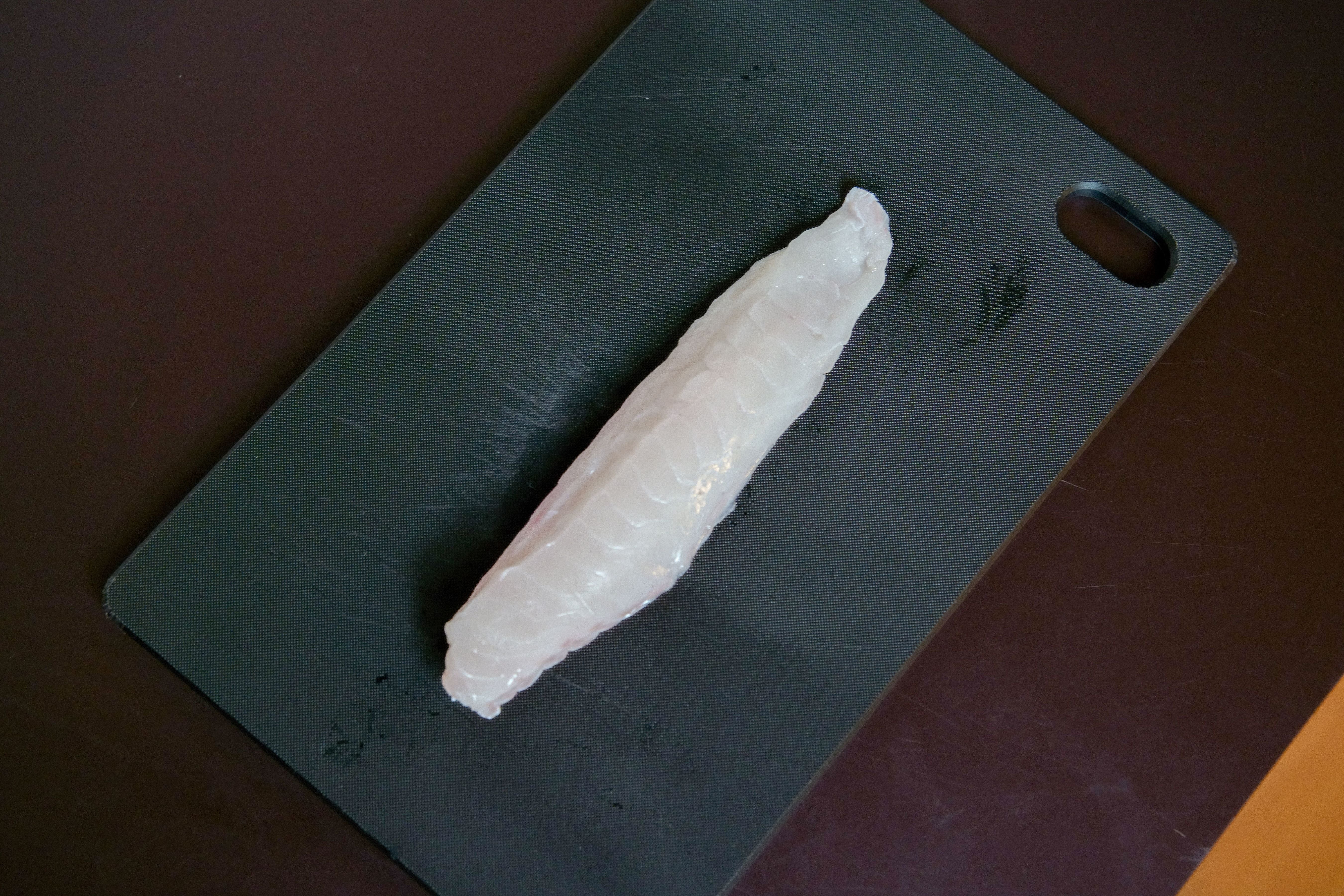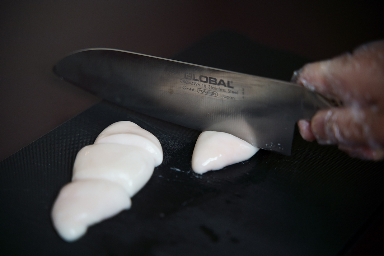 沸騰したお湯に、とうとうみ(白く厚い皮)は30秒、鮫皮(黒と白の薄い皮)は10秒ほど湯がきます。